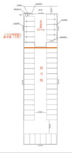 備 考 ※道路より左右10台は時間貸し駐車場予定(通路共有) ※市街化調整区域のため建築物・構築物は不可 ※該当地は区画予定なし(砂利敷のみ) ※共用通路となります(幅約5.5m) ※賃貸借契約締結後、農地転用許可、造成工事を行います ※契約後の敷地内の除草および整地費用は借主負担となります ※図面数字は概算になります ※残土・産廃スクラップ等は不可 ※賃貸保証会社に加入いただきます